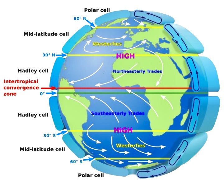 Ebenso sinkt die kalte Luft von den Polen herab und bewegt sich in Richtung Äquator. Das Aufeinandertreffen der heißen Luft vom Äquator und der kalten Luft von den Polen führt zu Regionen mit hohem und niedrigem Luftdruck entlang bestimmter Breitengrade.