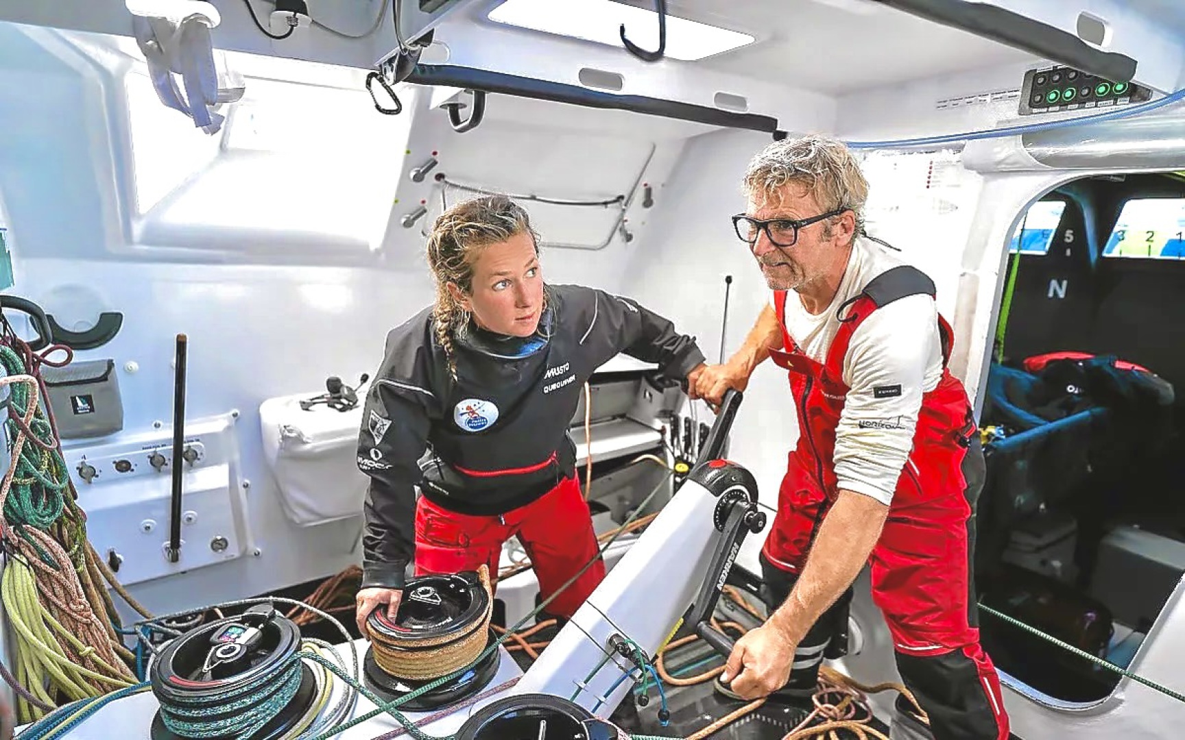 Denn diese neue Class40 hat einen nicht zu vernachlässigenden Vorteil: Sie ist die erste, die einen doppelten Wachposten bietet – einen unter der Kappe außen und einen innen, wo der Navigator noch besser geschützt ist und alle seine Bildschirme im Blick hat, insbesondere den des Computers. „Dieser doppelte Wachposten war nicht einfach zu entwickeln”, bemerkt Léo Chevance, der Architekt von Marc Lombard Yacht Design, der sich insbesondere mit der Struktur des Bootes befasst hat. Denn es galt, in jedem Fall eine gute Sicht nach außen und auf die Segel zu gewährleisten.” Nun, das ist ziemlich gut gelungen!