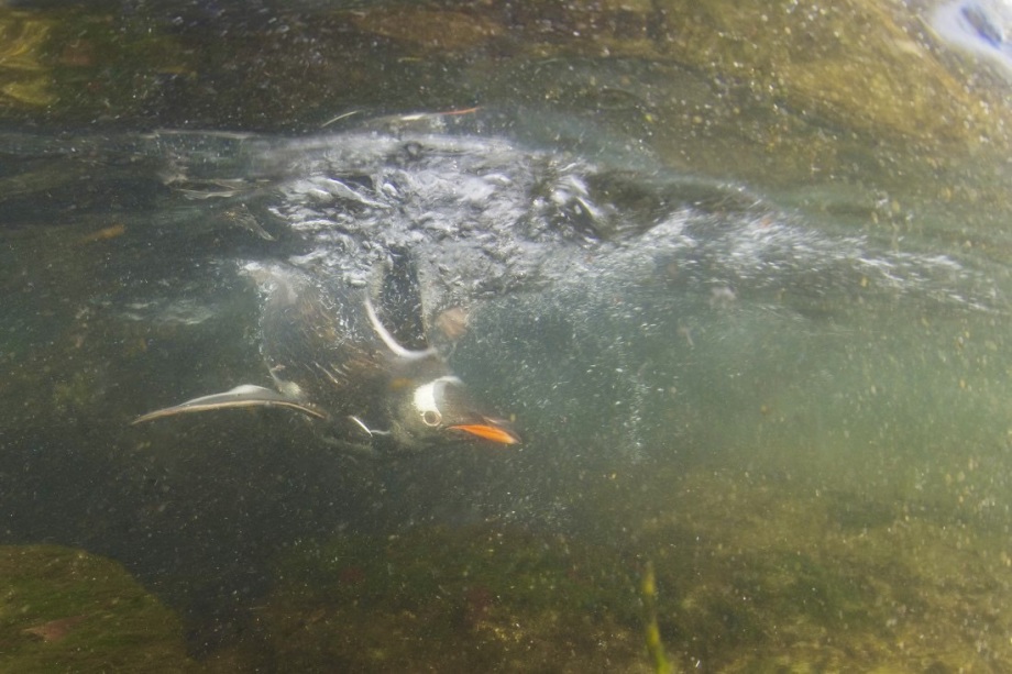 Bei Bedarf kann dieser gute Taucher zwischen 5 und 10 m tief tauchen und 1 bis 2 Minuten lang die Luft anhalten. Seine Flügel treiben ihn dabei mit hoher Geschwindigkeit voran, um den Fang von Meerestieren zu erleichtern. Der Pinguin kann mehrere Beutetiere in seinem Schnabel verstauen, um sie an die Oberfläche zu bringen und in Ruhe zu fressen.