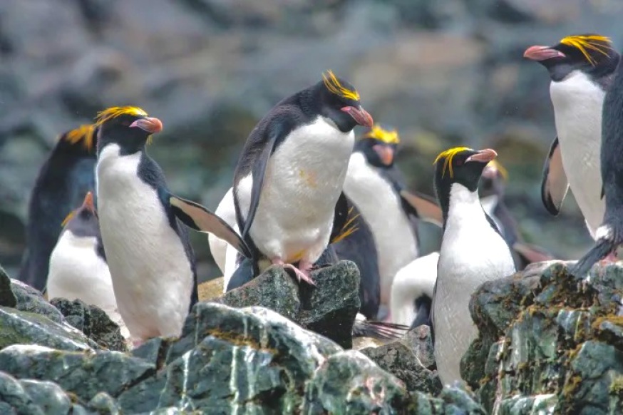 Felsenpinguin/Eudyptes chrysocome – Der Felsenpinguin wird weiter in drei Unterarten unterteilt, den nördlichen, südlichen und östlichen Felsenpinguin, und ist Gegenstand vieler Debatten über die Gesamtzahl der Pinguinarten. Sie leben auf kleinen, isolierten Inseln in den subantarktischen Regionen des Atlantischen und Indischen Ozeans. Die Nistplätze der Felsenpinguine befinden sich in zerklüftetem Gelände, sodass die Pinguine von Fels zu Fels hüpfen müssen, was ihnen ihren Namen eingebracht hat. Die Vögel können sich in Kolonien von bis zu 100.000 Individuen versammeln. Die Brutzeit beginnt im Oktober, die Eier werden im November gelegt und die Küken schlüpfen 33 Tage später. Der durchschnittliche Felsenpinguin wird 10 Jahre alt, kann aber bis zu 30 Jahre alt werden. Sie ernähren sich von Krill, kleinen Fischen und Tintenfischen. Felsenpinguine sind die einzige Art, die beim Tauchen mit den Füßen voran ins Wasser springt. Sie sind 46 cm groß und wiegen 2,2 bis 4,5 kg.