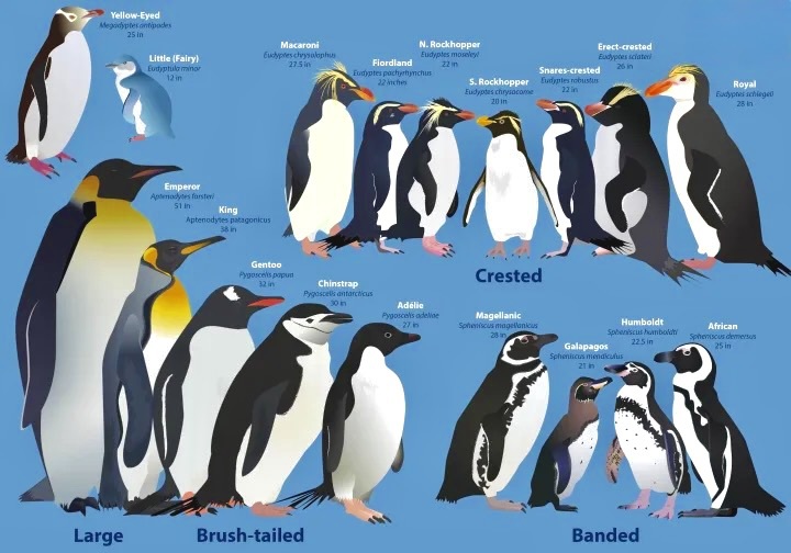 Pinguine bilden eine eigene Familie, die Spheniscidae, und sind wahrscheinlich am engsten mit anderen Vögeln wie Sturmvögeln und Albatrossen verwandt. Über die Anzahl der verschiedenen Arten wird noch diskutiert, aber es besteht allgemein Einigkeit darüber, dass es zwischen 17 und 19 Arten gibt. Die Arten sind in sechs Gattungen unterteilt, die gemeinhin als Haubenkönigspinguin, Zügelpinguin, Felsenpinguin, Großpinguin, Gelbaugenpinguin und Zwergpinguin bezeichnet werden.